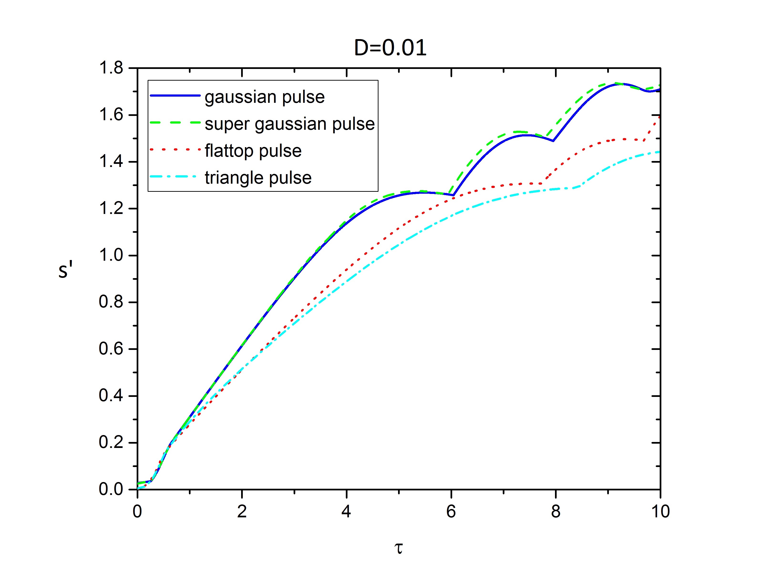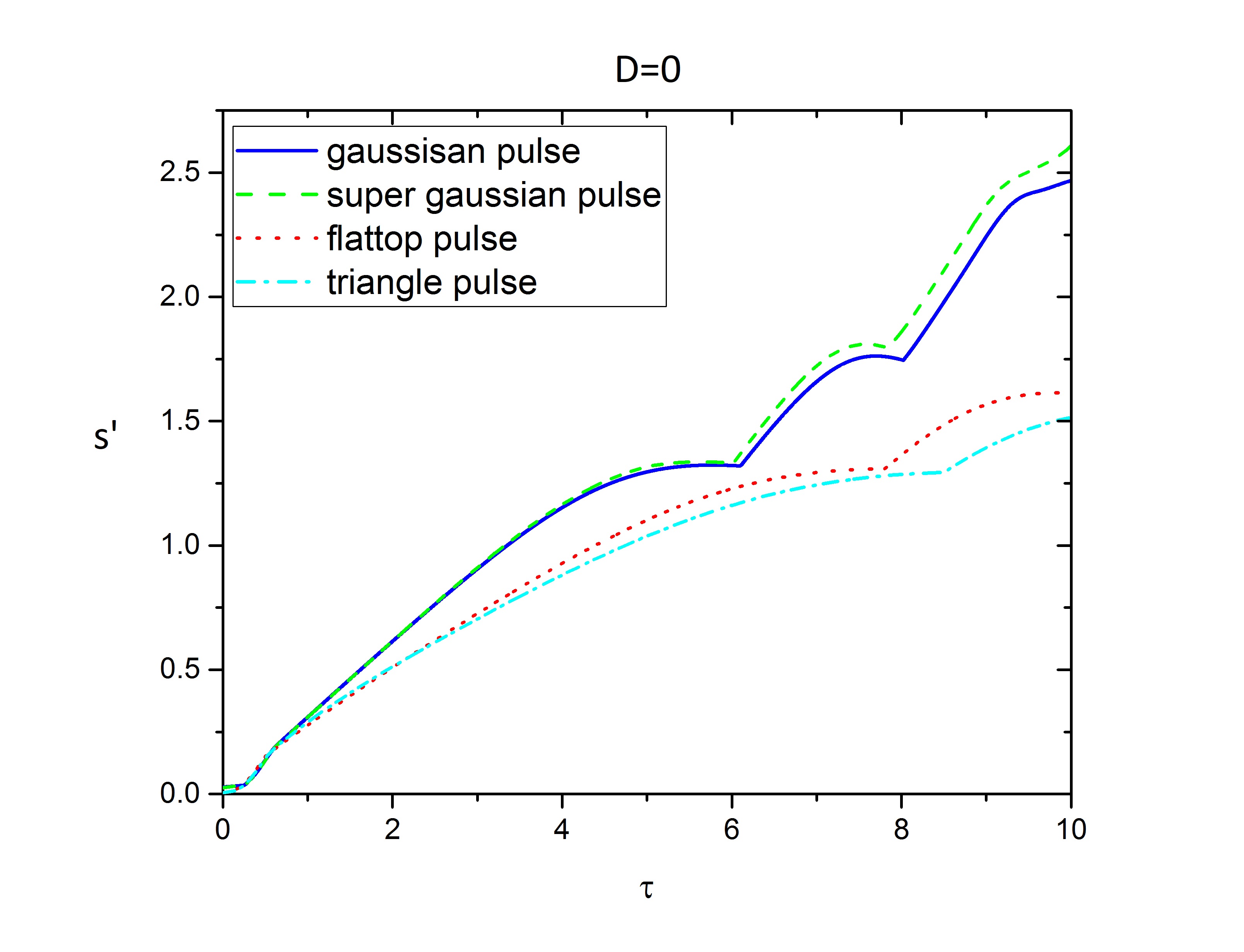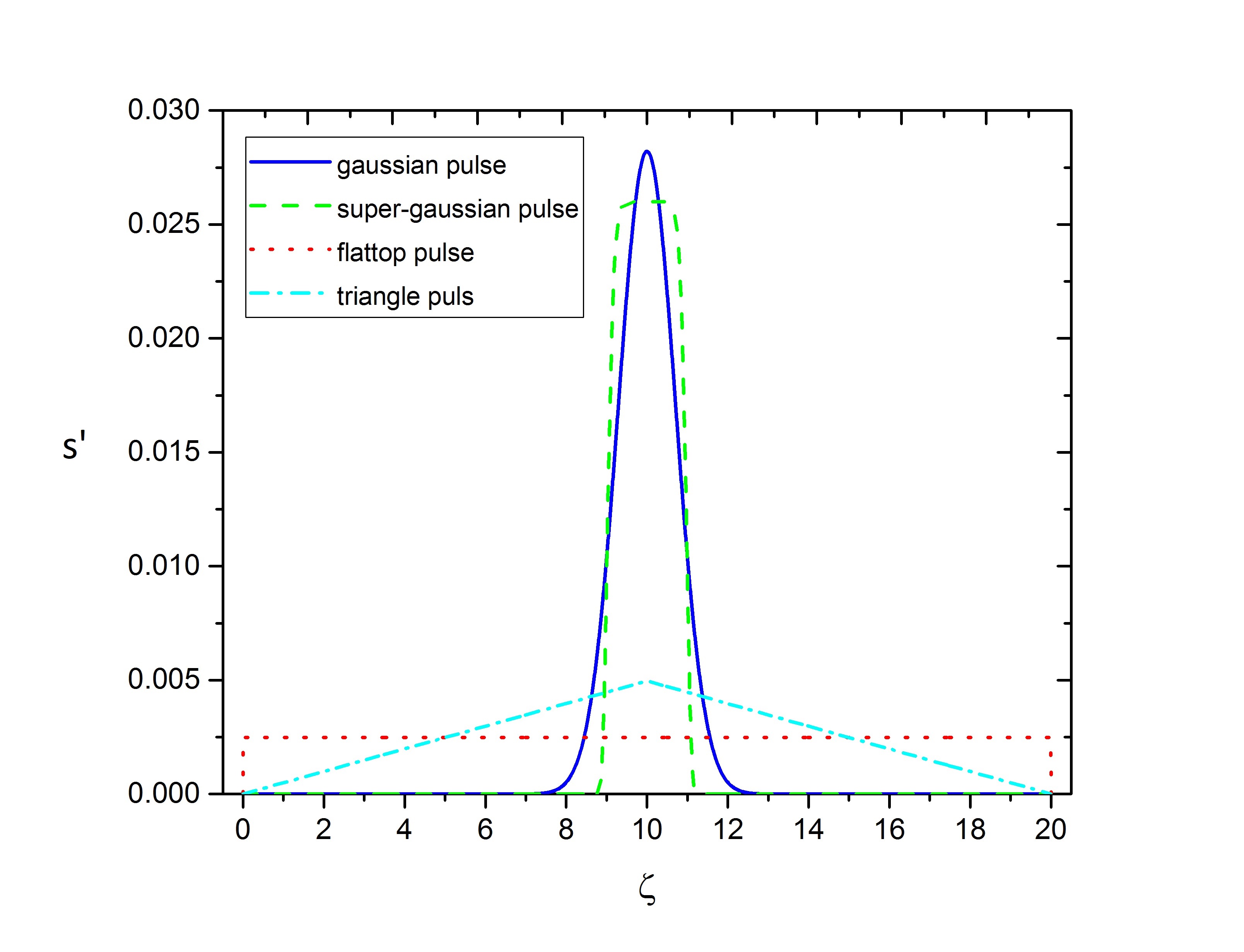 FIG. 5 shows a comparison between final shape pulse after finishing of amplification as a function of delayed time \(\zeta\).