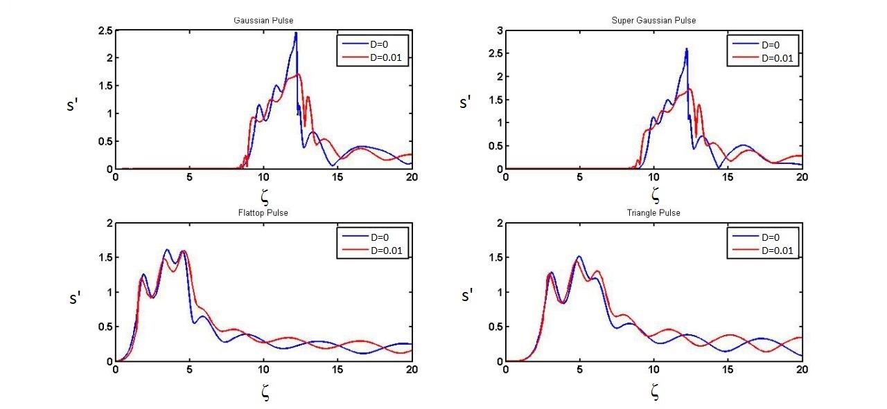The effect of group velocity dispersion on the Gaussian and super-Gaussian profile is obvious. On the other hand, group velocity dispersion doesn't have a significant effect on Flattop and triangle profiles. It shows that a second couple of profiles are a better option for dispersive media. They can resist group velocity dispersion.