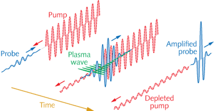 Leveraging plasma as an amplification medium offers a promising solution to tackle these challenges and limitations. Backward Raman Amplification (BRA) of laser pulses in plasma stands out for its potential to generate laser powers orders of magnitude greater than those achievable with Chirped Pulse Amplification (CPA) under comparable conditions. Plasma exhibits a natural oscillation mode characterized by the frequency \(\omega_P=\sqrt{{4\pi n_ee^2}/{m_e}}\), where \(n_e\) represents the plasma electron density and \(m_e\) signifies electron mass. This inherent property allows an external driver to resonantly induce a plasma wave, given specific conditions. Raman backscattering within plasma involves a resonant three-wave interaction, facilitating the transfer of energy from a pump laser pulse to a counterpropagating seed laser pulse via the excitation of an electron plasma wave. In simpler terms, this interaction occurs when a brief seed laser pulse (with frequency \(\omega_b\)), down-shifted from a longer counterpropagating pump pulse (with frequency \(\omega_p\) > \(\omega_s\)) by the plasma frequency \(\omega_P= \omega_b-\omega_s\), absorbs pump energy through a resonant decay mechanism involving the two counterpropagating light waves and a plasma wave.