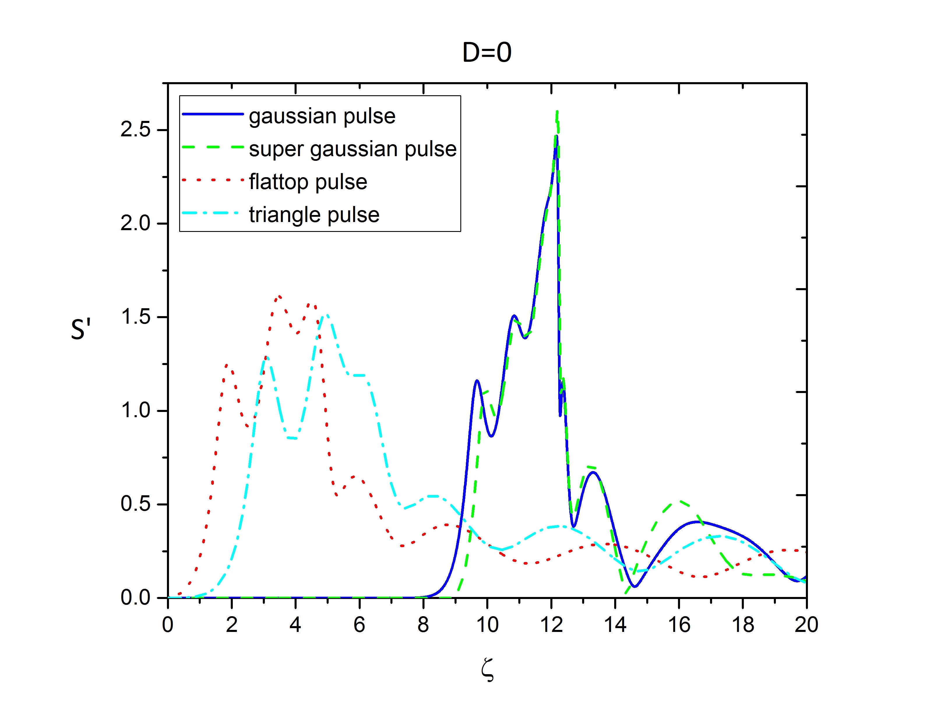 First, consider extremely under-critical plasmas where the group velocity dispersion can be neglected, so that the approximation \(D=0\) is good enough. So these equations can be solved by the Euler method, and we observe saturation due to the REN regime.