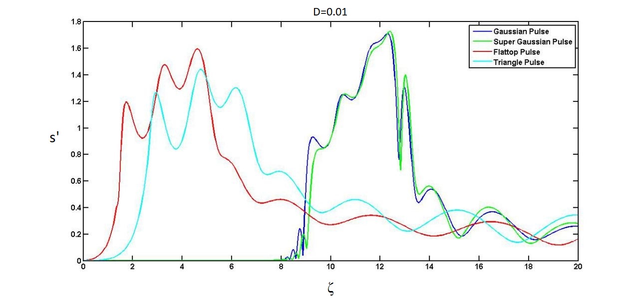 FIG. 7 shows the final shape pulse. The amplification of profiles is almost as same as each other. The amplified value of all pulses has been decreased by group velocity dispersion. There is no sign of a huge difference between profiles. It is clear that gaussian and super gaussian's forth spike is growing. The border pulse is another main point that indicates the group velocity dispersion's effect on the amplification of profiles.